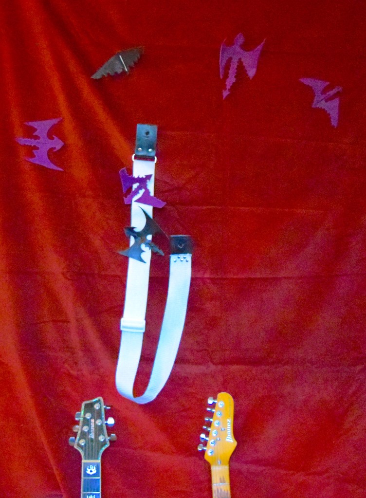 White Poly- propelene guitar strap that can be decorated as you see fit. See examples in the blog. Includes 1 Shadow Dragon Silhouette that can be attached via velcro to the strap, various colors sizes and silhouette shapes.