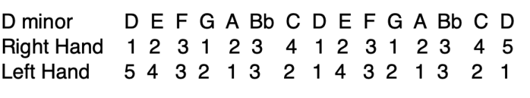 For example a D minor scale is played: (1=thumb, 2=index, 3=middle, 4=ring, 5=pinky)