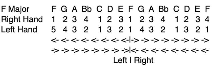 Easy enough when the fingering pattern aligns thusly but with certain scales this is not the case. For example F major D minors significant counterpart. The fingering does not align as easily to this method as one might hope. This was the challenge I was referring to earlier about lacking the ability to make those specific fingering combinations and could not even imagine putting in the work to try and do so. But one morning my head space was such that it just happened. While I am still not fluid and its not second nature as I would wish it is good to know it is possible to get there.