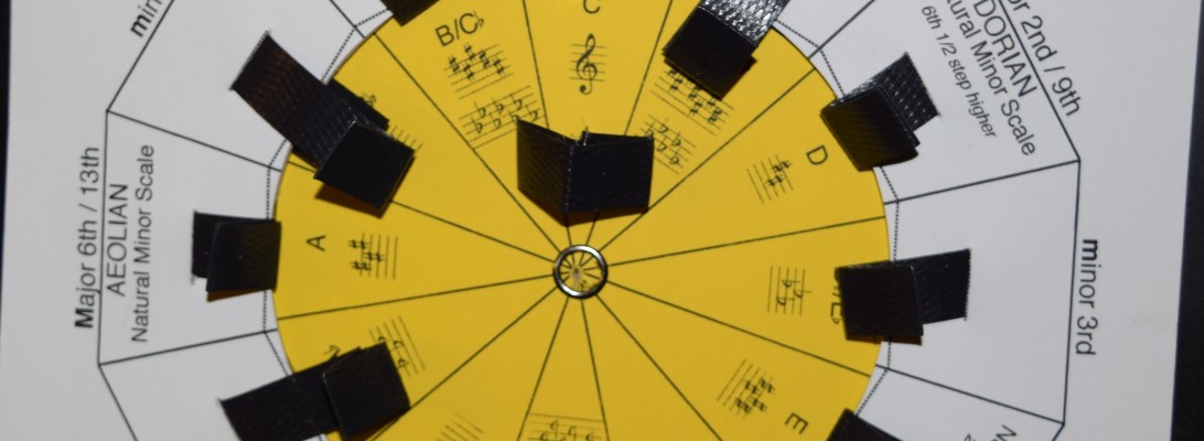 With in its dodecagonique shape lies an amazing ability to clearly display in alphabetic form the names of musical pitches found in a mode scale or chord and transpose that information in a snap with a twist or a turn!