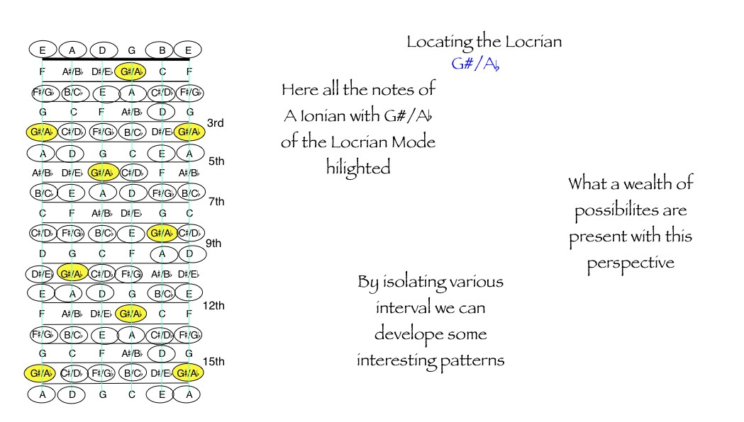 Experimentation is involved to get to the usefulness in expressing this mode in our playing. Remember to develop our technique in the various modes by not just playing them forwards and backwards, but crossways and slideways! The creative muscle is strengthened by searching out ways to make it relevant to our musical expression. I discovered whilst generating a fret board diagram of the Locrian / Ionian in the key of A that, across some frets on all strings an associated pitch could be found that is in key . See Diagram. I point this out as an additional exercise that does not demand too much mental effort looking for ‘pitches in key’ to make playing around with the scale an exercise in exploration and finger gymnastics without the associated ‘is that a relative pitch to the scale’ thought process. So in this case the relative pitches are found on all strings at the 2nd 7th and 9th fret.